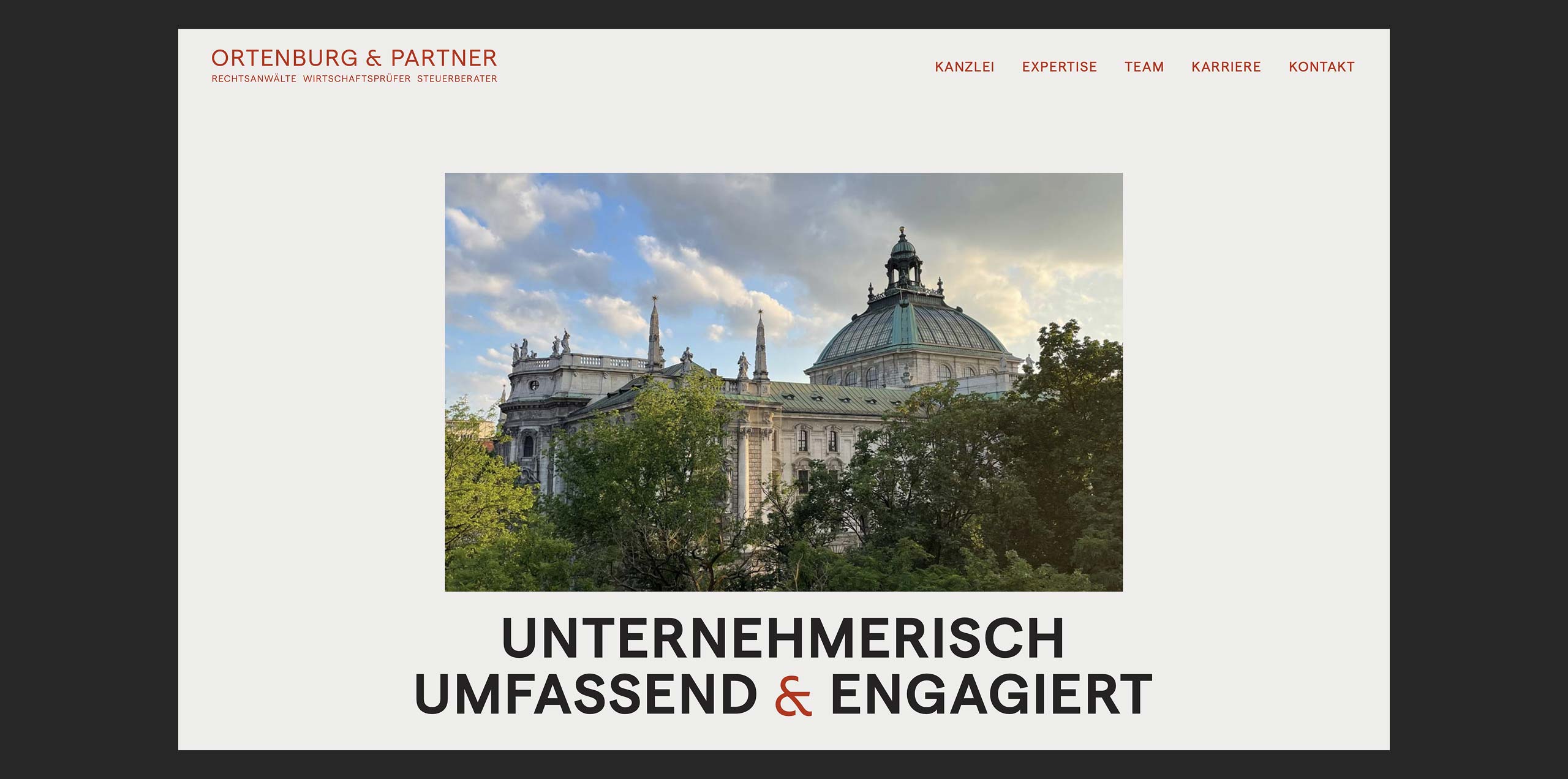 Die Rechtsanwälte, Wirtschaftsprüfer und Steuerberater aus München beauftragen uns mit dem Relaunch ihrer Website. Ziel ist ein prägnanter, zeitgemäßer Auftritt, der die fachliche Expertise ebenso sichtbar macht wie die Attraktivität der Kanzlei als Arbeitgeberin. Das neue Design überzeugt durch ein reduziertes, minimalistisches Typografiekonzept, den gezielten Einsatz von Akzentfarben und eine charakterstarke Fotografie. Neben einer klaren Informationsstruktur liegt ein besonderer Fokus auf dem Karrierebereich sowie auf der optimalen Performance auf mobilen Endgeräten – für ein Nutzererlebnis, das auf allen Ebenen überzeugt.