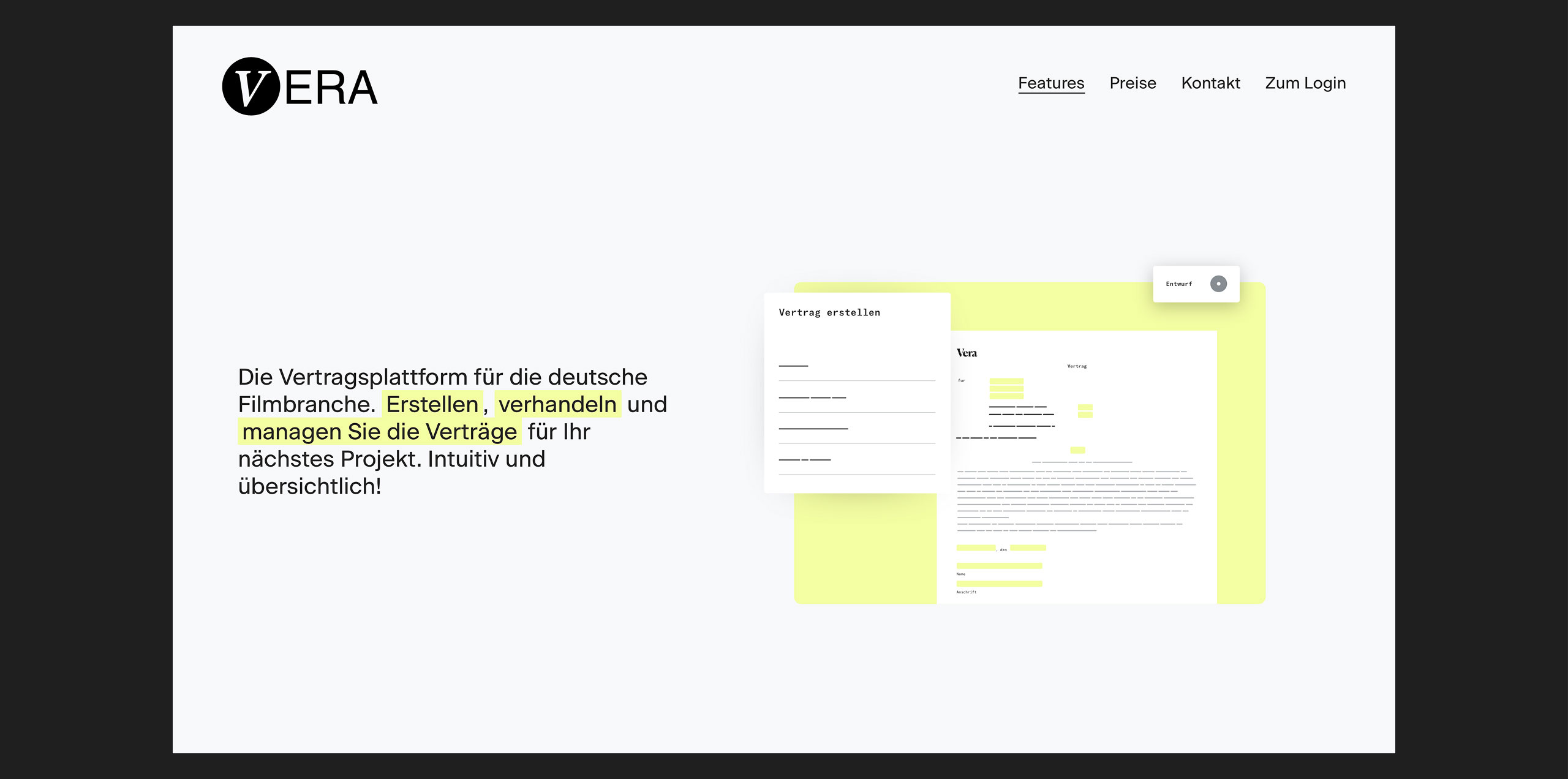 Constantin Film beauftragt uns mit der Entwicklung eines Corporate- und UX/UI-Designs für die Unternehmensseite von Vera Contracts. Ziel ist ein digitales Erscheinungsbild, das den komplexen Funktionsumfang der Plattform klar strukturiert und verständlich vermittelt. Unsere Lösung: ein reduziertes, nutzerzentriertes Design und ein präzises Storytelling, das die Inhalte auf den Punkt bringt – und die User gezielt zu relevanten Informationen und Anfragen führt. So entsteht ein klarer Auftritt, der Usability und digitale Markenidentität wirkungsvoll verbindet.